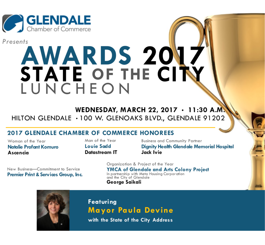 Congratulations to all of our honorees and our sincere appreciation for their contributions to the Glendale business community. Please join us as we celebrate their accomplishments and look forward to this year’s State of the City Address presented by Mayor Paula Devine!